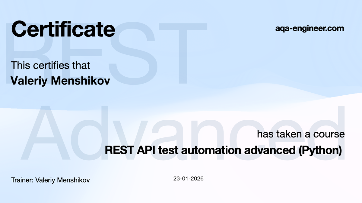 Сегодня я завершил курс по REST and GRPC API test automation (Python)Это были интересные 7 недель)Курс содержит очень большое количество полезной и важной информации. Есть ссылки на все дополнительные материалы. Содержательный видео в которых нет воды и хорошо объясняется материал. За время обучения получаешь хороший опыт здорового написания автотестов. С каждым новым заданием сложность растет и растет проект, что очень круто. Ощущал во время учебы, что я работаю над сложным и интересным проектом с отличным ментором который всегда на связи.Курс подходит для тех кто действительно хочет учиться, стимулируют сроки сдачи д/з, рекомендовал бы спланировать время перед началом обучения, чтобы не сидеть по ночам как это делал я)Жду новых курсов. Спасибо!!!